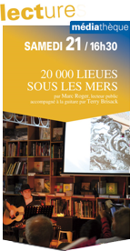 Samedi 21 octobre à 16h30 Médiathèque Michel-Crépeau 20 000 LIEUES SOUS LES MERS de JULES VERNE lu par Marc Roger, accompagné à la guitare par Terry Brisack