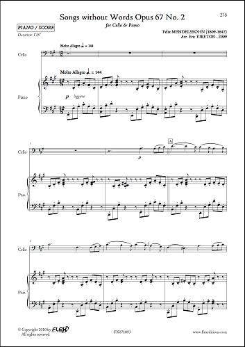 Formation : Violoncelle et Piano. Instrumentation : Violoncelle, Piano. Niveau de Difficulté : Intermédiaire/Avancé. Durée : 1'35''. Style Musical : Classique. Catégorie : Arrangement. Compositeur : Mendelssohn Felix. Arrangeur : VIRETON Eric